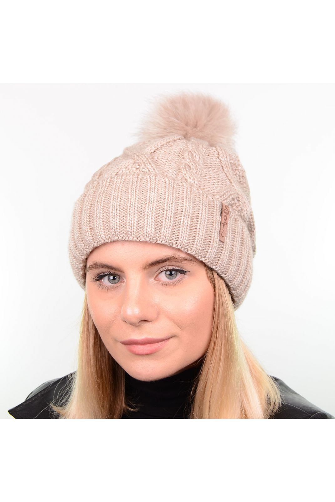Модна зимова шапка з натуральним хутряним помпоном - виглядає красиво та стильно. Модель виконана цікавою крупкою в'язкою, шкіряною фурнітурою "Sofi", відмінно підійде під будь-який верхній одяг і буде доречна у вашому гардеробі, незалежно від того, якому стилю ви віддаєте перевагу. Такий привабливий аксесуар не тільки доповнить образ, а й зігріватиме вашу голову в осінньо-зимовий сезон.