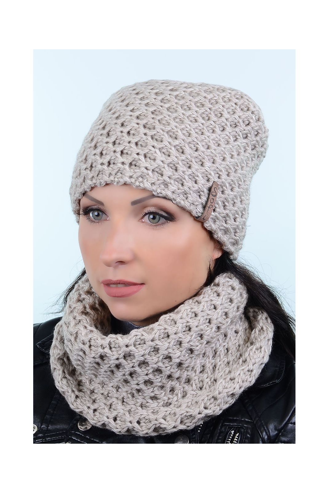 Стильный женский комплект - послужит красивым дополнением к любой верхней одежде. В набор входят вязаная шапка, утепленная флисом и шарф хомут, выполнены интересной узорной вязкой. Декором служит кожаная фурнитура с надписью «Sofi». Размер хомута: высота – 25 см, длина – 28 см.